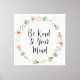 Bring warmth, calm, and positivity into your space with this elegant stretched canvas print. Featuring the hand-lettered quote “Be Kind to Your Mind” surrounded by a soft pastel floral wreath in light pink and green, this artwork is a gentle reminder to prioritise self-care and mental wellness.