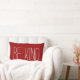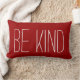 The perfect reminder for all! Be Kind, in white text on crimson red pillow. Back of pillow has small text which says: In a world where you can be anything....