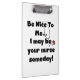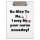 A cute nurse design clipboard any nurse will love, features a stethoscope and text that reads Be Nice To Me..I May Be Your Nurse Someday!