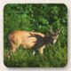 A photograph of a young buck, with velvet antlers, in some green leaf bushes.