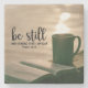 Inspirational scripture stone coaster depicts a peaceful scene of an open Bible sitting next to a cup of steaming hot beverage, maybe coffee or tea, on a railing overlooking the water. It features Bible Verse Psalm 46:10, "Be still and know that I am God." *