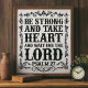 Decorate your home with timeless encouragement from Psalm 27. This “Be Strong and Take Heart and Wait for the Lord” poster is a powerful reminder of faith, strength, and patience. Featuring bold vintage typography surrounded by elegant decorative flourishes, it makes a stunning addition to any room. Printed with high-quality inks on premium paper, this Christian wall art is perfect for bedrooms, living rooms, offices, or church spaces. A meaningful piece of inspirational scripture art for those who draw strength from their faith.