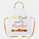 Eat, Drink and be Thankful typography, pumpkin and leaves Thanksgiving apron. It features the text "Eat, Drink and be Thankful" and a row that includes a pumpkin, leaves and acorns in fall colours.
