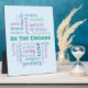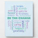 A colourful word cloud design plaque with the text "Be the Change" in the centre, surrounded by words like peace, love, kindness, compassion, integrity, honesty, and generosity, reflecting positive traits and aspects that the world could use a lot more of.