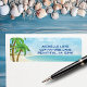 This address label features a tropical beach with palm trees. The water is a beautiful blue and there are clouds scattered in the sky. Created by MI Designs