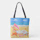 Stay in a beachy state of mind all the time with this personalised tote bag, featuring a conch, starfish and a good book. Personalise with any name. Great as a beach bag.