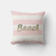 Big cabana stripes in pale pink with Beach art text image. A familiar seashore scene of sand, sea and little seabird scampering along the ocean edge.
