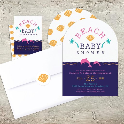 Beach theme with sea shell, palm trees and dolphins.