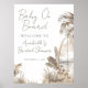 Welcome guests to your baby shower in style with this boho beach-themed sign, perfect for setting the tone for a fun and relaxed celebration. The design features a warm welcome message in soft tan and brown tones, using a mix of handwritten script calligraphy and classic serif fonts for a balance of elegance and modern style. On the left side, a beautifully illustrated surfboard is paired with a tropical palm tree, delicate orchid flowers, and lush greenery, capturing a serene coastal vibe.