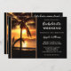 Beach bachelorette weekend itinerary template featuring a sunset at a tropical beach with palm trees. You can choose your own background colour to replace the black if you like. Beautiful for a tropical weekend getaway.