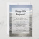 Beach themed birthday party invitation for a man. Customise text in two places over a sunrise beach background image in blue and grey colours. Sea foam on the sand and waves in the distance is the background for party information which is printed over a transparent white panel. Bold text at the top for his name and age with party information printed beneath with space for lots of information.