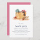 Chic beach party invitation is perfect for birthday parties or any beachy occasion! Summery design features a watercolor illustration of a beach bag nestled in the sand, with sunglasses, flip flops and seashells. Personalise with your beach party details in a chic mix of classic serif and modern sans serif typography.