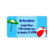 A new custom address label with blue custom letters and fun beach or swimming pool themed art of a red beach ball, green sun umbrella on a watery blue background with curly waves. Customise it to change fonts, colours, elements, label size and more, even save your design for later.