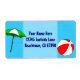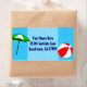 A custom label with blue letters and fun beach or swimming pool themed art of a red beach ball, green sun umbrella on a watery blue background with curly waves. Customise It to change fonts, elements, label size and more, even save your design for later.
