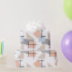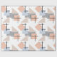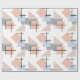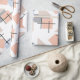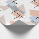 This wrapping paper has a Bauhaus design of repeating rectangles, squares, diamonds, and triangles in beach colours of tan, grey, blue, and orange.