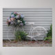 Old beach bicycle painted white with pink and blue hydrangea flowers in the basket and leaned against a grey wooden wall is pretty,nostalgic, and evokes memories of seaside vacations and innocent times.