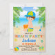 Cute invitation for boy's birthday featuring little boy, sand castle, beach and blue ocean, and some tropical party equipment.