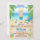 Cute invitation for boy's birthday featuring little boy, sand castle, beach and blue ocean, and some beach party equipment.