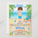 Cute invitation for boy's birthday featuring little boy, sand castle, beach and blue ocean, and some beach party equipment.