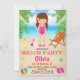 Cute invitation for girl's birthday featuring little girl, sand castle, beach and blue ocean, and some tropical party equipment.