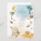Celebrate the bride-to-be with this beach themed bridal shower invitation featuring a watercolor picnic scene with palm trees in yellow, orange and neutral tones.