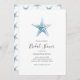 Wondering "where to buy customizable beach bridal shower invitations online" Celebrate the bride-to-be with these invites designed with a simple hand painted watercolor starfish in shades of blue. Set against a crisp white background, the design highlights her name in elegant script with event details in a classic charcoal serif font. The back features a starfish patter bold, island-inspired look.