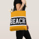This fun sporty design features athletic BEACH text inside a wide black stripe highlighted with white stripes against bright yellow orange background. The text can be personalised.