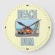 A vintage red hot rod with flames parked at the beach with a surfboard next to it and the caption "Beach Bum"