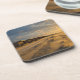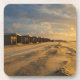 Plastic photo coaster with a row of beach cabins on the North Sea beach of Kijkduin in the Hague during a nice sunset in the Netherlands.