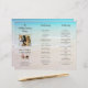 Beach scene photo template folded wedding program. Beach ceremony program to be folded into thirds after purchase. Add a special photo of the couple, which will appear on the front of long, folded programs. Easily add your wording to three sections over a sea and sand background image. Starfish dressed as a bride and groom decorate the front page. The same turquoise water and beach sand image covers the back of this paper.
