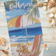Fun and colourful beach scene with a striped sun umbrella and beach chair that is easily personalised. Great beach towel for vacations in the sun, Spring Break, pool time, bachelorette parties and ocean beach fun!