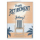 Send warm wishes to the retiree as they embark on their next chapter with this happy retirement card! Against a serene sunset backdrop, a cosy beach chair takes centre stage, surrounded by lush tropical foliage including palm trees. Inside, framed by silhuette palmtrees, heartfelt congratulations await. Celebrate the retiree's achievements and toast to their new adventures with this delightful card.