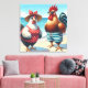 A rooster and a hen dressed in beach swimwear stand on a sandy shore with blue ocean waves in the background