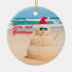 Cute beachy Christmas ornament with snowman and santa hat on a tropical beach. Warm wishes for the holidays and Seas and Greetings!