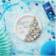 Celebrate the season with this festive and beachy paper plate, perfect for a Christmas in July celebration. The design features a whimsical Christmas tree made of beach shells, starfish, and coral on the right side, adding a fun coastal vibe to your table setup. The palette includes shades of teal blue and tan for a relaxed, summery feel.