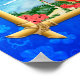 Happy Holidays from the warm sandy beaches of your favourite tropical island beach. Palm tree decorated with Christmas ornaments and lights, with a retro surfboard leaning against the Christmas tree, in a bamboo frame.