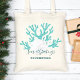 Personalise this beach Christmas tote bag with aqua blue glitter coral, white sand dollar and starfish, and the holiday message “Seas & Greetings”.