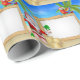 Santa Claus Christmas cartoon with Santa playing on a beach making sandcastles by the beach with tropical palm trees, parrot and large blank sign for your text