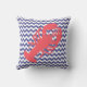 Stylish decorator accent throw pillow done in a beach cottage theme, with a trendy blue and white chevron zigzag pattern. A coral coloured silhouette of a lobster decorates the middle of the pillow. Lovely way to add a splash of colour and style to your living space.