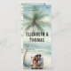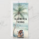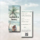 A trendy design of an aeroplane ticket wedding invitation with a tropical destination theme (Hawaii etc.) featuring a modern illustration of a palm tree on a tropical beach, with the aqua waters in the background, will delight couple and guests, looking forward to the big day. Template for a picture of the happy couple. An all in one modern wedding invitation that includes the details on the back and the RSVP card with a QR code.
