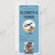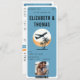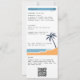 A trendy design of an aeroplane ticket wedding invitation with a tropical destination theme (Hawaii etc.) featuring a modern illustration of an aeroplane taking off over waves and palm trees, with the glowing sun in the background,, will delight couple and guests, looking forward to the big day. Template for a picture of the happy couple. An all in one modern wedding invitation that includes the details on the back and the RSVP card with a QR code.