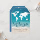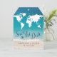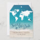 A destination beach wedding save the date in the shape of a luggage tag with a world map and moveable heart you can place in your exact wedding location and a relaxed sandy beach and ocean background picture. Our romantic heart aeroplane accents the design, and you can add your wedding website on the back so that guests can start planning their travel to your unique adventure wedding venue.