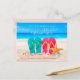 Colourful Save the Date Card perfect for a Beach Wedding or Destination Wedding. It features a bright picture of two pairs of flip flops on the sand, with a cute starfish and the ocean in the background. The design is perfect for an ocean front wedding, or a wedding with a beach theme. The colours are happy and ideal for a summer wedding.