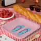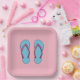 An illustration of a pair of pink and blue beach flip flops. It's summertime! Let's take a break and have some fun under the sun. Aren't you excited to prepare all your stuff for vacation? Don't forget your flip flops.
