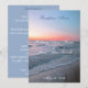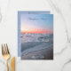 The Beach View wedding collection features a beautiful calm and romantic beach view scene. The front of the design features a beach view photo of calm and romantic waves gently rolling onto the sand and grass of the shore line at sunrise. The beautiful glow of the sunrise has cast an array of colours in the horizon and reflecting off the ocean waves. As you stare into the rolling waves you can almost feel the ocean breeze and taste the salt in the air. The photo was taken at sunrise on Hilton Head Island, South Carolina. The backside of the invite is originally designed in a calming blue shade, but can be changed to any colour by using the "customise it" feature. Use the custom wording template to personalise your wedding reception menu with your own wording. This design is wonderful addition to any outdoor or beach themed wedding.