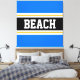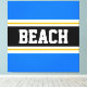 This colourful sporty design features bold BEACH text inside a wide black horizontal centre stripe with white and golden yellow racing stripes against bright blue outer stripes. The text can be personalised.