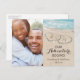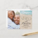 Beach destination save the date postcards featuring a photo of you and your partner, a sandy beach with two hearts in the shoreline, summer blue ocean waves, your initials and a text template that is easy to personalise.