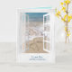 Names of couple in beach hearts and sand with frothy ocean surf and open window view.