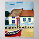 Beach House and Boat on Sandy Beach Poster