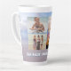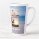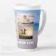 Tall latte mug with beach scene background. Customise with four photo templates and text along the bottom. A calm, blue sea and smooth beach sand is the background for sharing some fun photos of the kids, vacation, pets, and family time.